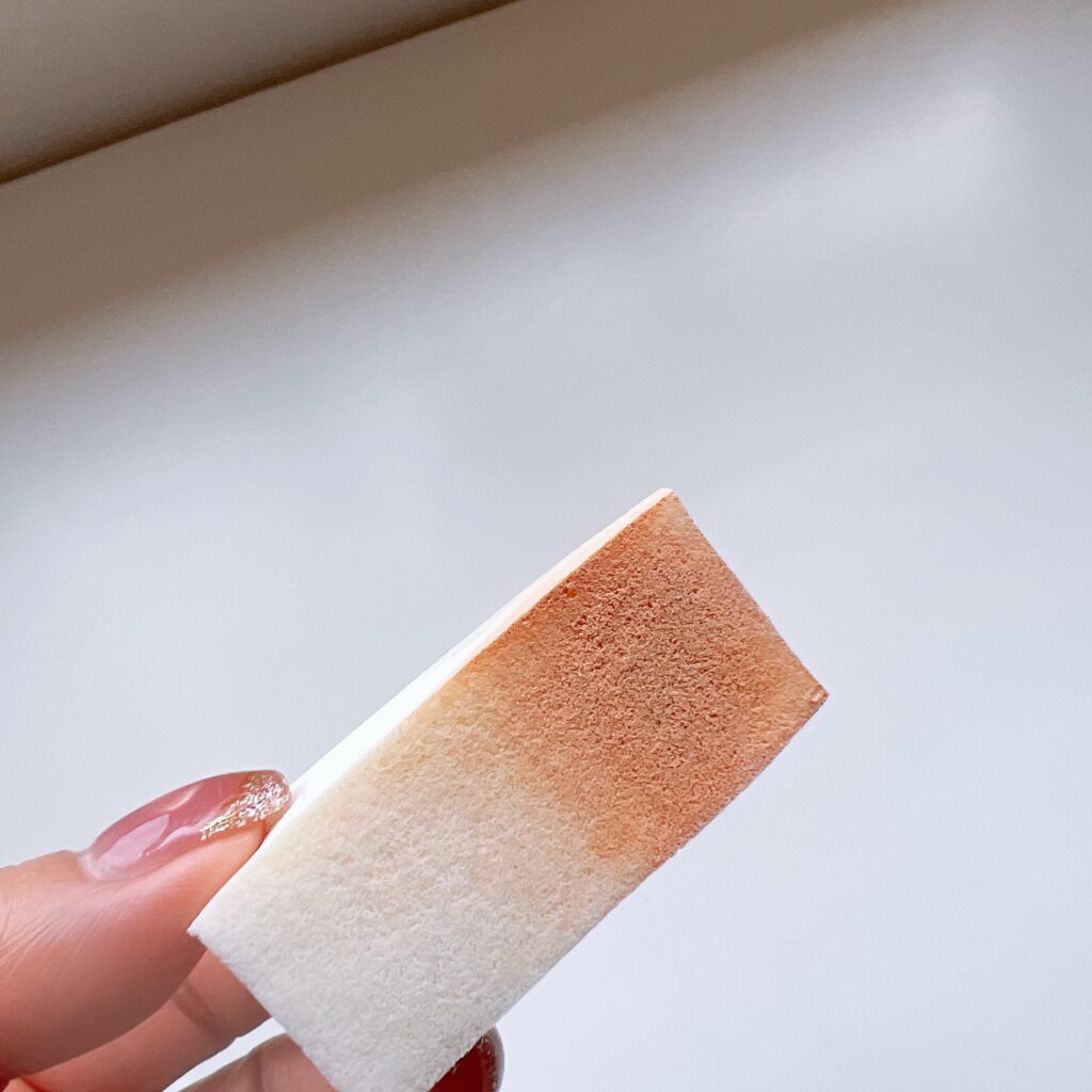 Georgeさんがおっしゃっていたのですが、よく売っている三角の「切りっぱなしスポンジ」で伸ばして馴染ませるのがポイント。手で塗るよりもずっと肌に密着して、自然な仕上がりになりますよ。